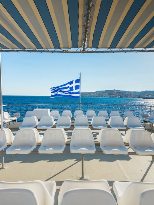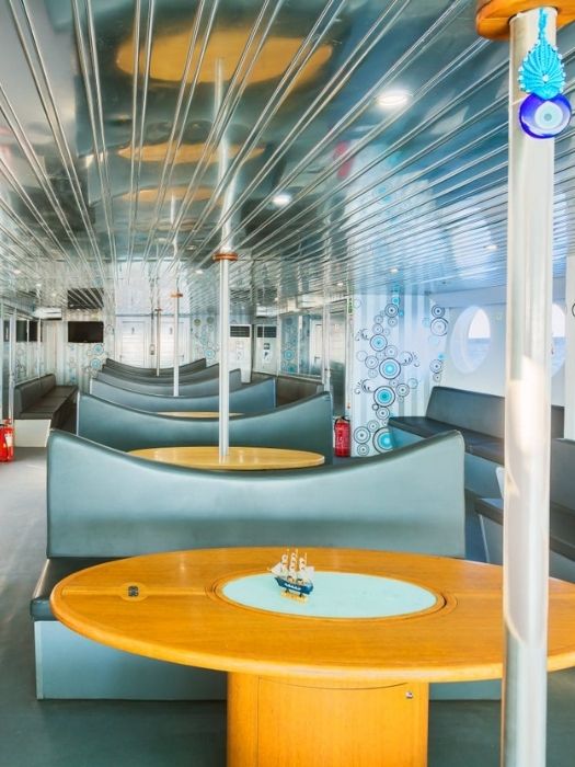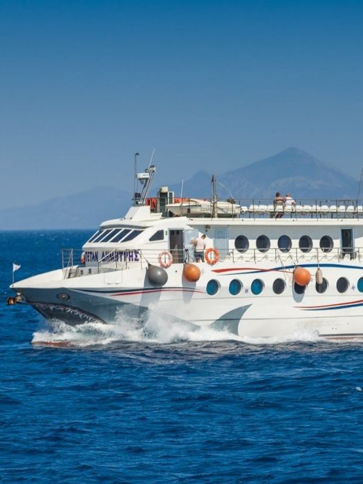 Next leg of the adventure involves a fast ferry ride to Nisyros. The boat, a double-decked vessel, offers seating options on both the lower and upper decks.