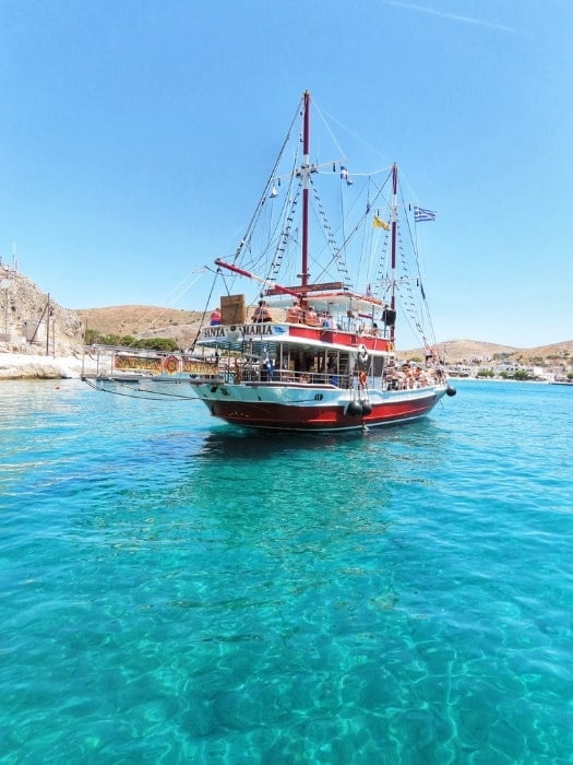 Santa Maria 3-island cruise is a 7.5-hour lazy day boat trip to Kalymnos, Plati, and Pserimos with multiple swim breaks during the day.