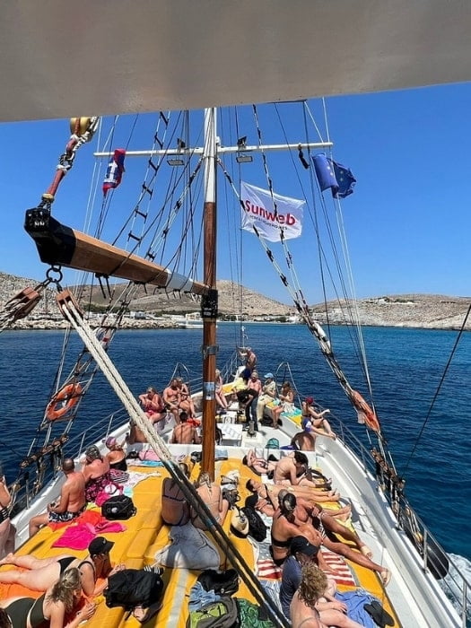 Santa Maria is an 80-foot wooden boat, and it departs from the Kos harbor at 10:00 AM. If you arrive early, you will have the chance to take your preferred spot.
