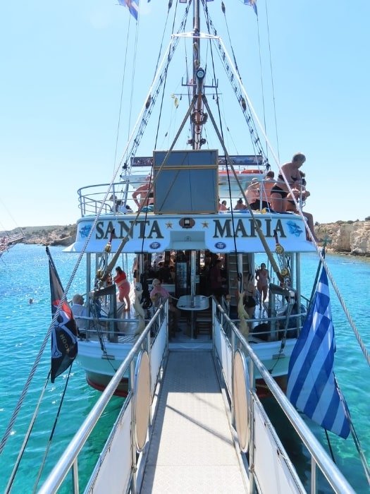 Santa Maria, is departing every day at 10:00 AM and returns at 5:30 PM. It is a double-decked boat with shaded areas and sunbeds where you can sunbathe.