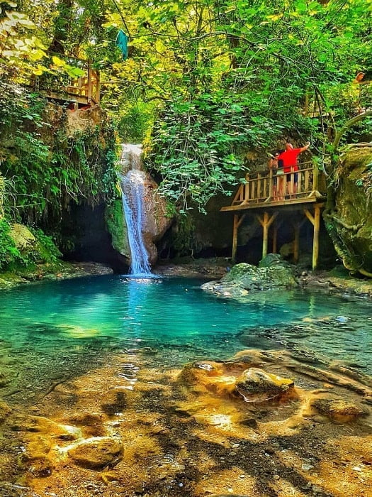 • Swim at Turgut Waterfall surrounded by green trees and plants.