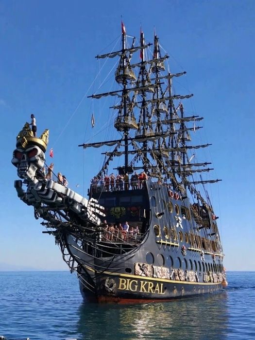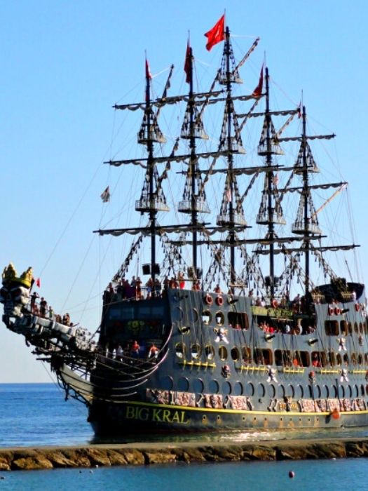 Side Big Kral boat trip is more than just a regular boat ride. You will set sail on a huge pirate ship with tall masts across the azure waters of the Mediterranean Sea. Big Kral means “Big King” in Turkish. It is a huge ship indeed, very imposing. A comfortable minibus will take you in the morning to the port near TĂĽrkler. You will visit the most beautiful bays and grottoes and have a great time swimming and sunbathing. Then the boat will take you to Alanya city centre where you will have free time while the kitchen team prepares a delicious lunch for you. It will be served as a buffet with drinks, so no one will be left hungry or thirsty.