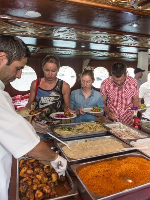 During your shore time the crew will be on board preparing lunch and then you return back on board for a remarkable buffet lunch and cooling drink. A 3 course lunch is offered via buffet service, normally consisting of meats,rice, pasta, 6 starters and fruit. The bar serves unlimited soft drinks and beer and wine. Spirits are payable and will be subject to availability. The buffet and drinks are complimentary and unlimited throughout the time aboard.