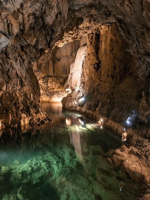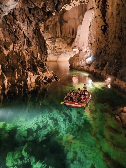 The cave itself is relatively high and reaches p to 40 metres in parts.  There are different levels to the cave, some of which are dry and some that need to be visited by boat as you glide over the underground lake.  There is even a waterfall inside which is truly a sigh to be seen.